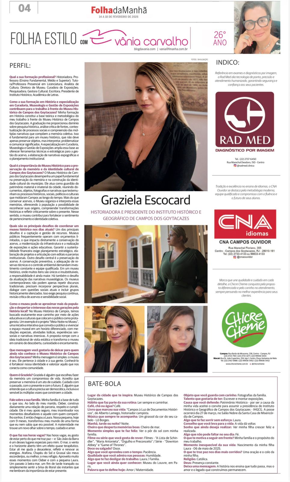 Graziela Escocard: memória, maternidade e missão à frente do Instituto Histórico e do Museu de Campos Meta descrição:Conheça Graziela Escocard, historiadora, diretora do Museu Histórico