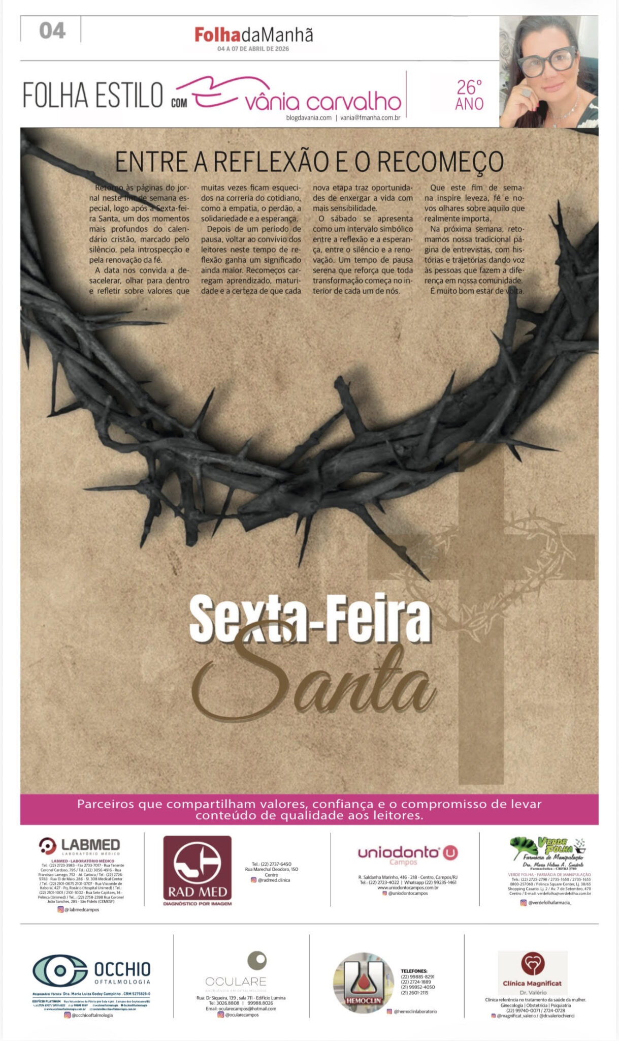 Entre a reflexão e o recomeço Retorno às páginas do jornal neste fim de semana especial, logo após a Sexta-feira Santa, um dos momentos mais