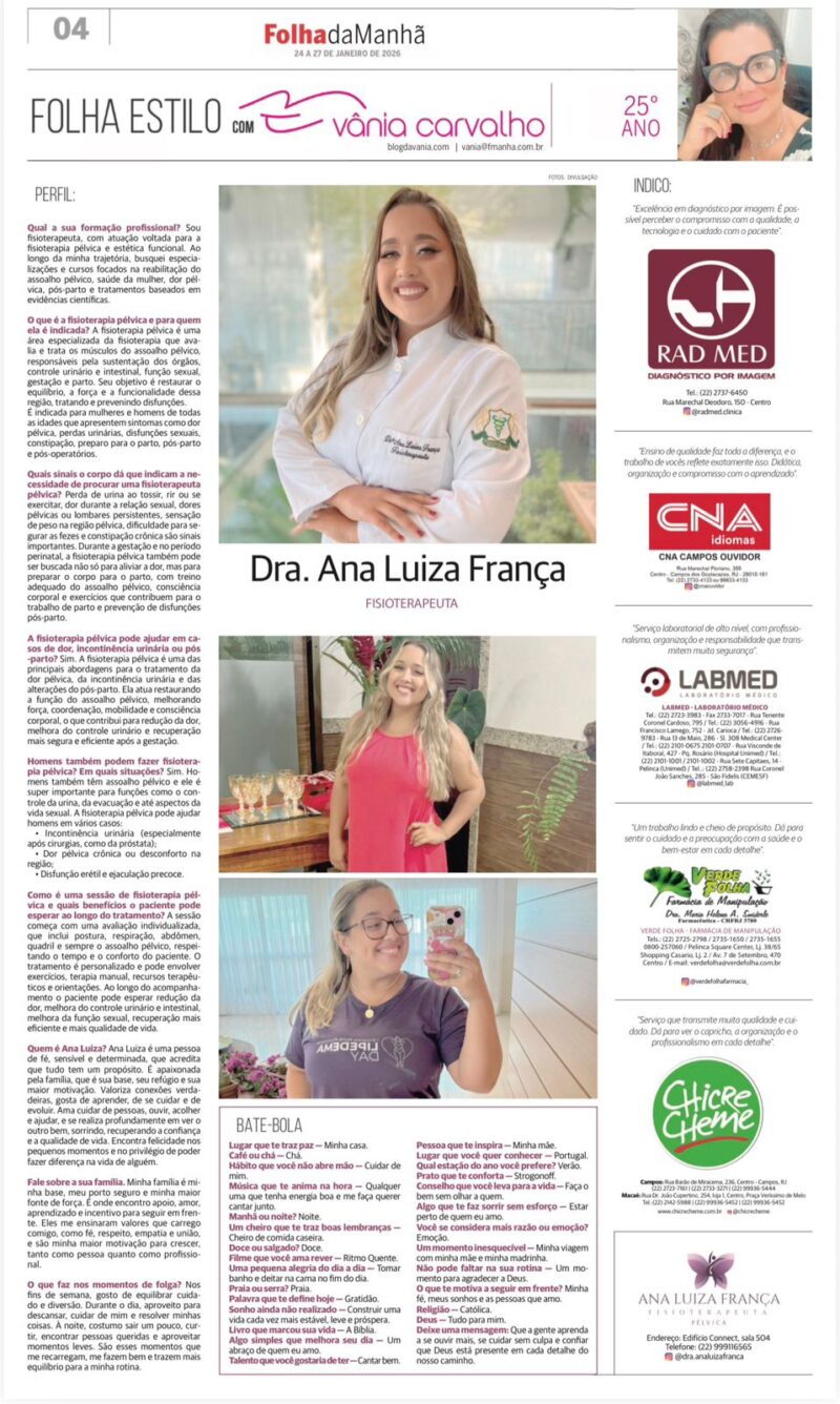 A fisioterapia pélvica vai muito além do tratamento físico. Ela envolve escuta, acolhimento, conhecimento científico e respeito ao corpo em todas as suas fases. É com esse olhar sensível e profissional que Ana Luiza construiu sua trajetória na fisioterapia.