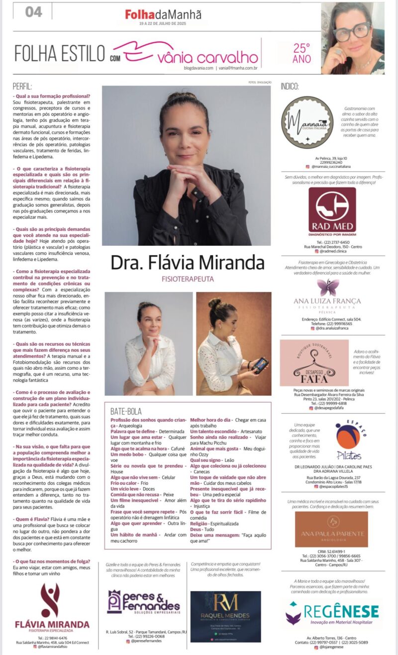 Fisioterapia especializada com olhar humano e técnicas de alta performance Formação e especialização: um caminho construído com propósito A Dra. Flávia Miranda é fisioterapeuta com pós-graduação em terapia manual, acupuntura e fisioterapia dermato funcional, além de cursos específicos nas áreas de pós-operatório, intercorrências, feridas, linfedema, lipedema e patologias vasculares. Sua atuação vai além do consultório: […]