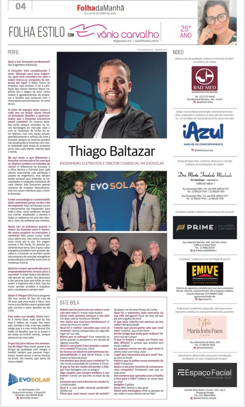 7 anos de Evosolar com Thiago Baltazar – Engenheiro Eletricista e Diretor Comercial na Evosolar Perfil: Qual a sua formação profissional? Sou Engenheiro Eletricista A Evosolar está completando 7 anos. Olhando para essa trajetória, qual você considera ter sido o maior marco ou conquista da empresa até aqui? O Maior marco da empresa, sem dúvidas, […]