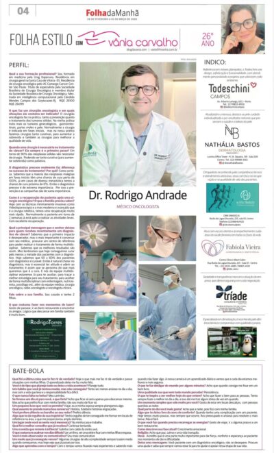 Dr. Rodrigo Andrade – Médico Oncologista O Dr. Rodrigo Andrade é médico oncologista, com atuação em cirurgia oncológica e tratamento de tumores sólidos. Com formação