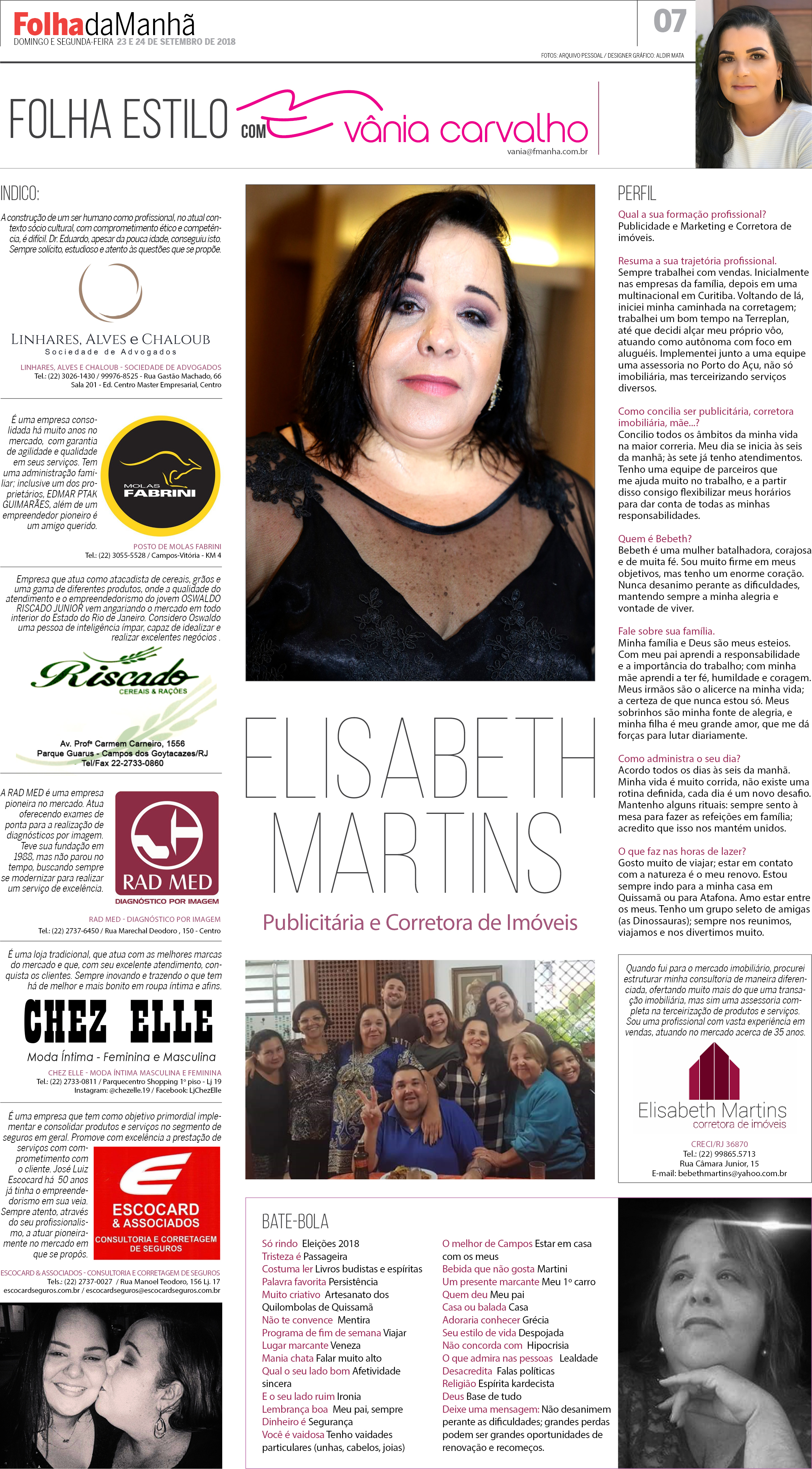 Elisabeth Martins – Publicitária e Corretora de Imóveis PERFIL: – Qual a sua formação profissional? Publicidade e Marketing e Corretora de imóveis. – Resuma a