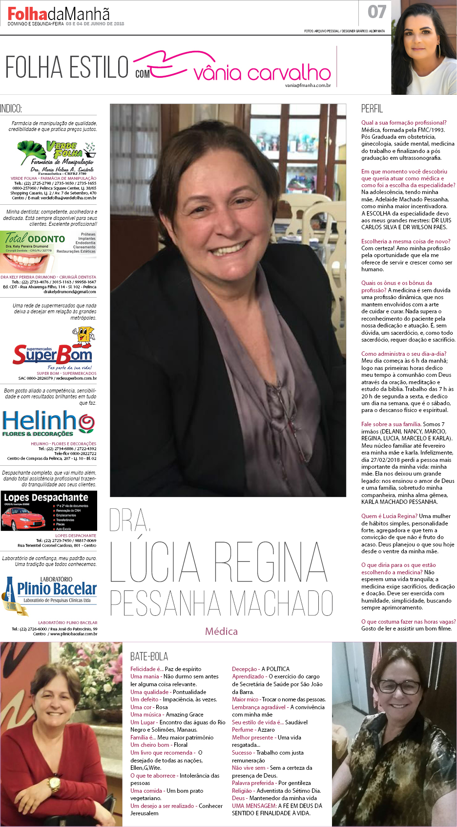 Dra. Lúcia Regina Pessanha Machado – Médica PERFIL: Qual a sua formação profissional? Médica, formada pela FMC/1993. Pós Graduada em obstetrícia, ginecologia, saúde mental, medicina