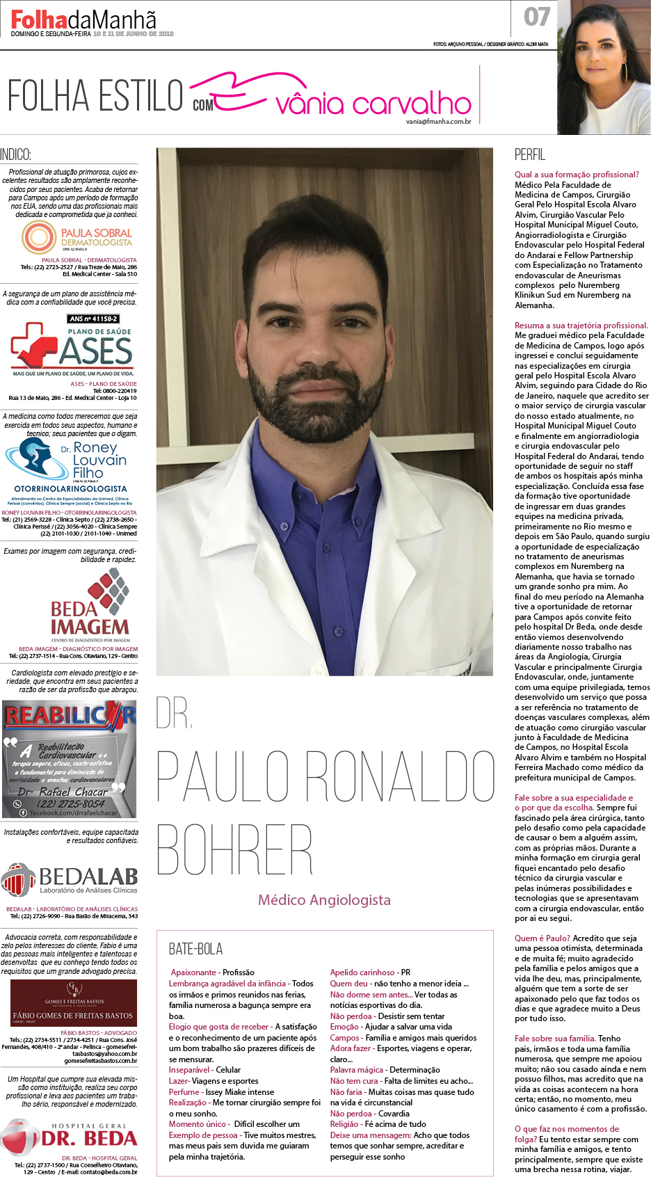 Dr Paulo Ronaldo Bohrer – Médico Angiologista Perfil: – Qual a sua formação profissional? Médico Pela Faculdade de Medicina de Campos, Cirurgião Geral Pelo Hospital Escola