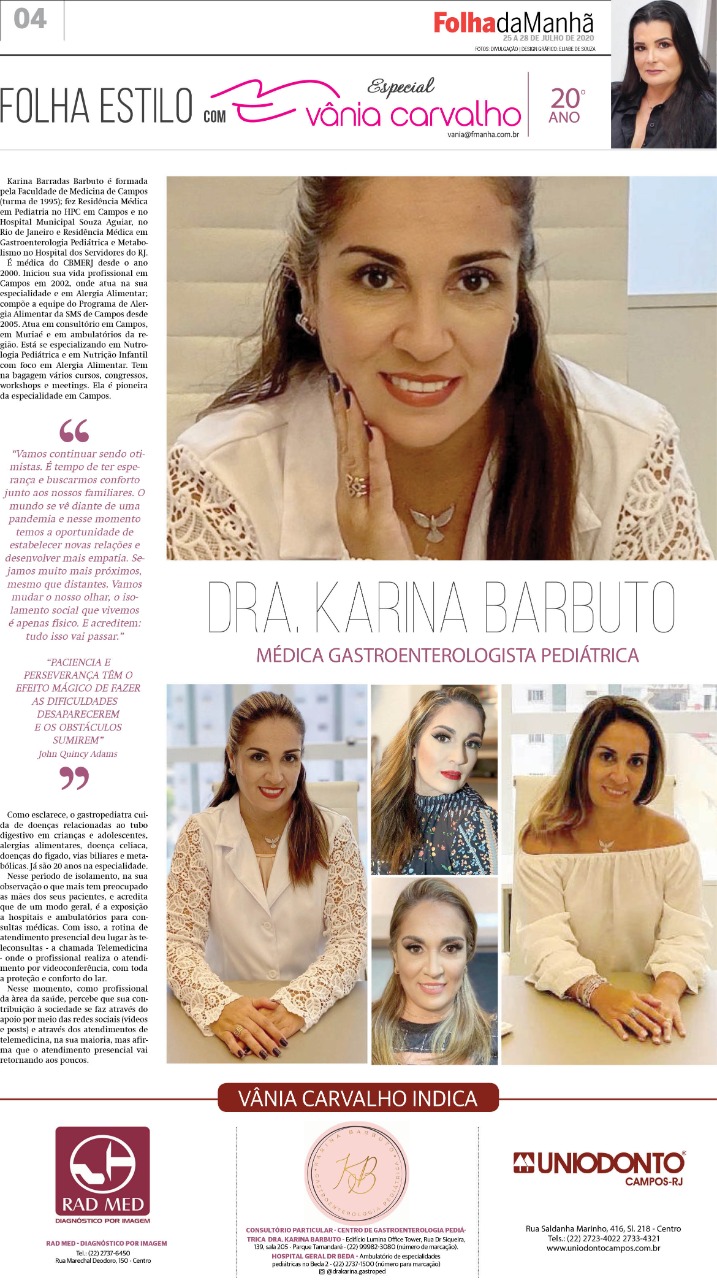 Karina Barradas Barbuto é formada pela Faculdade de Medicina de Campos (turma de 1995); fez Residência Médica em Pediatria no HPC em Campos e no Hospital Municipal Souza Aguiar, no Rio de Janeiro e Residência Médica em Gastroenterologia Pediátrica e Metabolismo no Hospital dos Servidores do RJ.